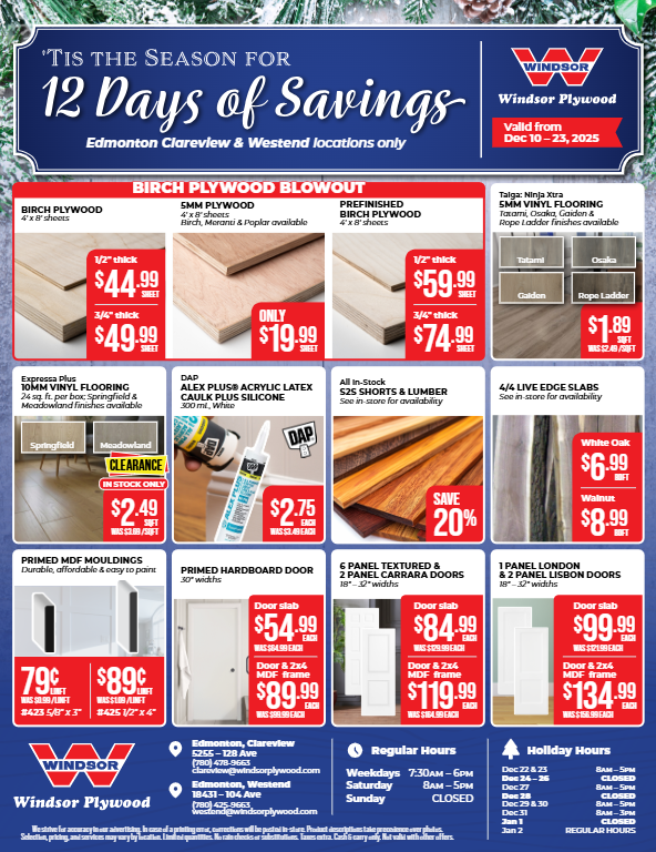 Windsor Plywood in Edmonton Westend is your go-to source for premium interior and exterior finishing materials. Explore premium flooring, interior and exterior doors, detailed mouldings, and an impressive selection of wood products including specialty lumber, hardwoods, and sheet goods. From classic profiles to unique sizes, you can bring drawings or measurements to compare options and select materials that meet your style, performance, and budget goals.