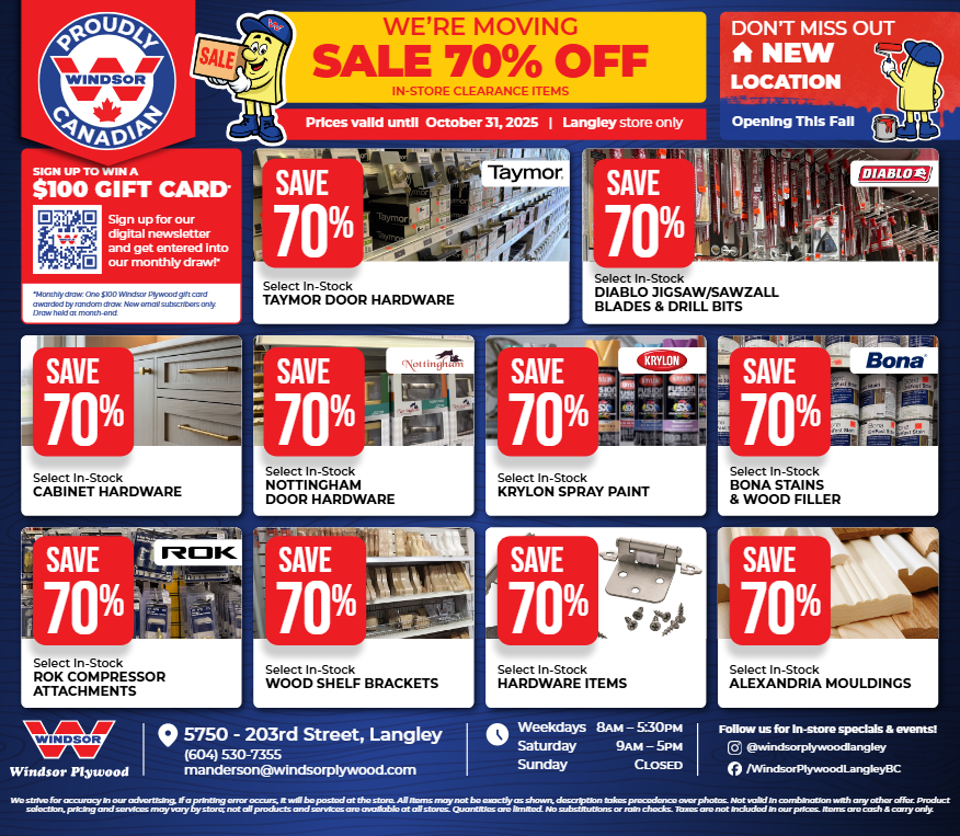 Windsor Plywood Langley is relocating due to SkyTrain construction, so our current location must be vacated. In the meantime, we’re running lots of sales—visit us in-store and follow us on social media for daily specials!