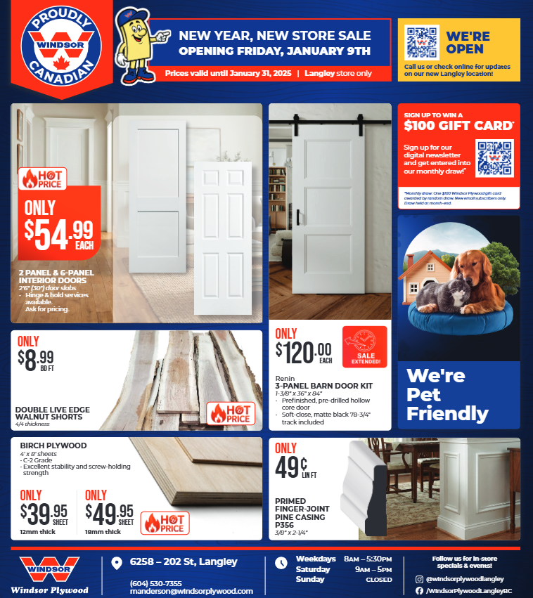 As a proudly Canadian, locally owned store, we focus on delivering personalized service and practical solutions. We are deeply connected to our community, donating our time and resources to local charitable causes and hosting groups such as the Cloverdale Carvers’ Club for events in our store. Our experienced team is here to provide expert advice, precision lumber cutting, custom door building in our fully equipped shop, special order service, and reliable delivery to your home or job site. Whether you are a homeowner, DIYer, contractor, designer, or builder, we are ready to help you bring your vision to life from start to finish.
